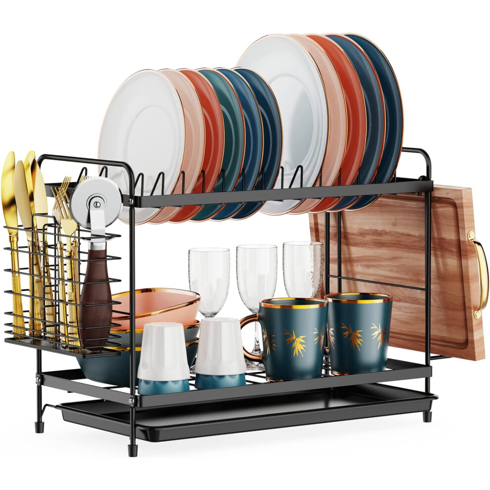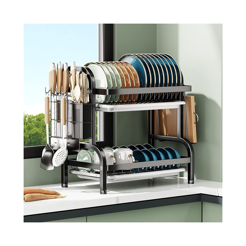 2-Tier Dish Drainer Dish Drying Rack with Tray Utensil Holder Cutting Board Rack 4 Hooks Large Capacity Dish Drainer for Kitchen Counter Saving Space