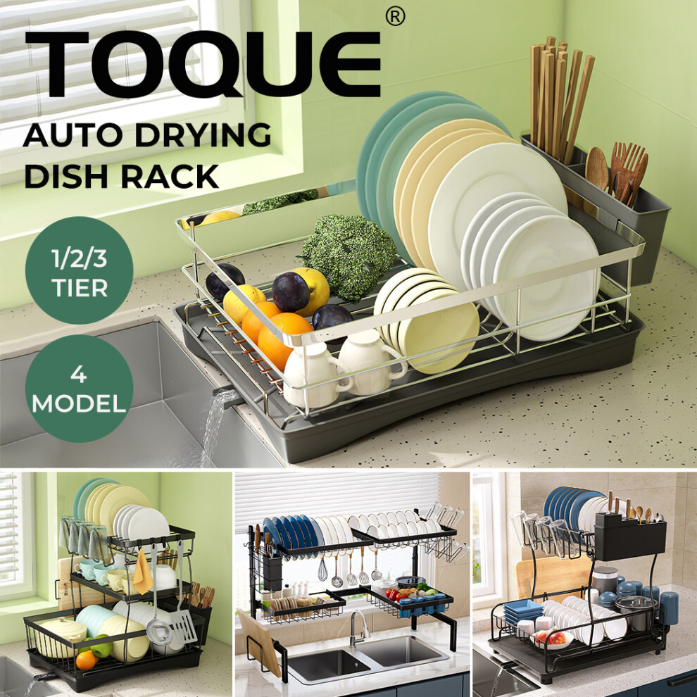 (2 Tier Black, 2 Tier Expandable) Toque Dish Drainer Drying Rack Drip Tray Stainless Steel Expandable Over Sink