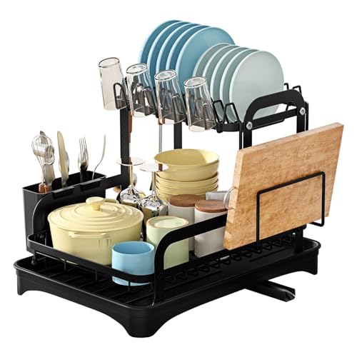2-tier Dish Drying Rack, Stainless Steel Drainer with Large Capacity, Drip Tray, Cutlery And Cup Holders, Space-saving Organizer for the Work Surface, Robust (black)