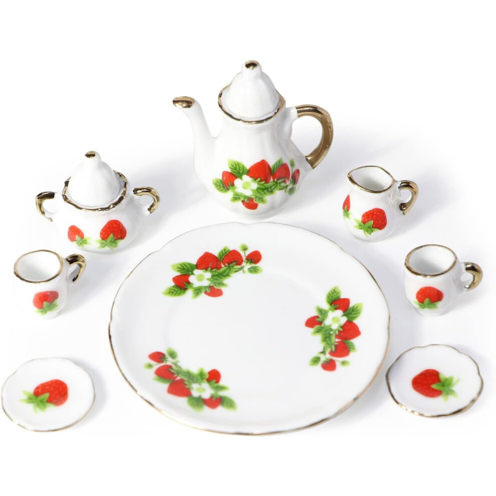 1:6 Scale Miniature Porcelain Dollhouse Tea Set 8PCS Flower Pattern Teapot Platter Dish Sets Dollhouse Kitchen Supplies Decoration (Strawberry)