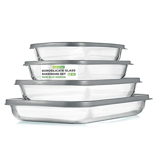 NutriChef 4 Sets Glass Bakeware - High Borosilicate Rectangular Glass Baking Dish w/Gray BPA-Free PE Lids, Freezer-to-Oven Home Kitchen Bake Casserole Food Storage Stackable Tray Pan, Dishwasher Safe