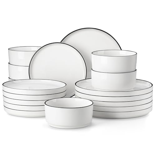 MALACASA 18 Pieces Porcelain Dinnerware Set, Dish Set for 6, Premium Plates and Bowls Sets, Chip and Scratch Resistant Dining Ware Set, White with Black Rim, Series LEAH