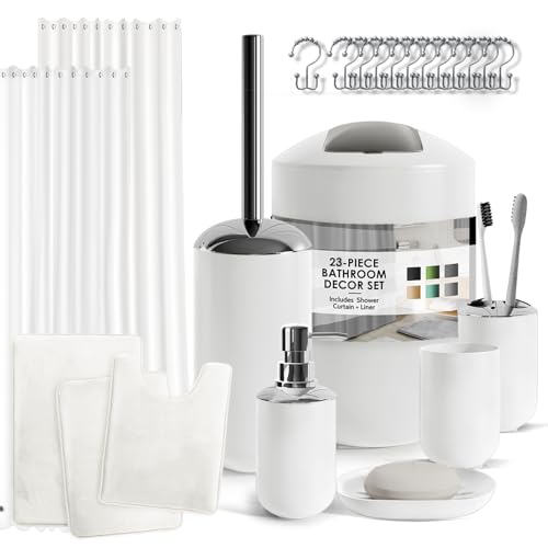 Clara Clark Bathroom Set - White Bathroom Accessories Set, Bathroom Sets with Shower Curtain and Rugs, 23PC Shower Curtain Set with Liner, Soap Dispenser, Soap Dish, Toilet Brush Holder, and Trash Can