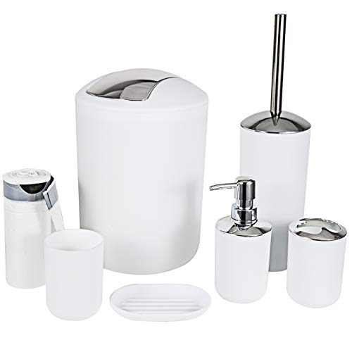 longsheng 6 Piece Bathroom Accessories Sets,Bathroom Set 6 Pieces Plastic Lotion Dispenser,Toothbrush Holder,Bathroom Tumblers,Soap Dish,Trash Can,Toilet Brush Set with Drawstring Trash Bags (White)