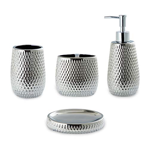Silver Bathroom Accessory Set 4 Piece Ceramic Bath Accessories Sets Complete, Rain- Drop Shaped Bathroom Essential with Toothbrush Holder & Dish, Tumbler, Soap Dispenser Set for Bath Decor