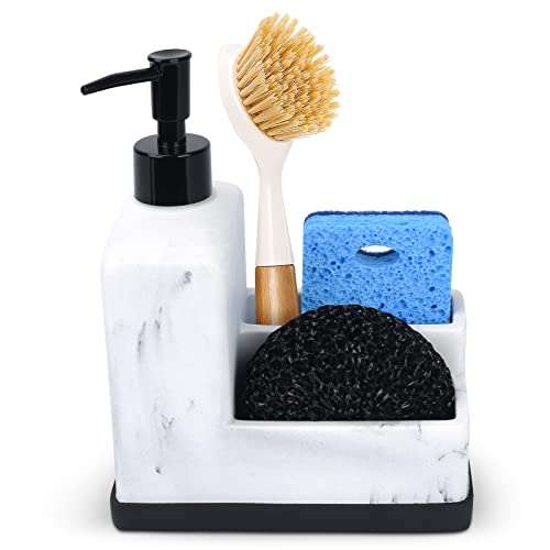 Dish Soap Dispenser with Sponge Holder,White Marble Look Liquid Hand and Dish Soap Dispenser and Spong Caddy with Brush Holder 3 in 1 Countertop Organizer for Kitchen Sink and Bathroom,White