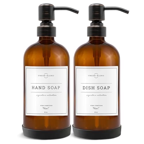 Vine Creations Amber Glass Soap Dispenser 2 Pack, Thick 16oz Bottles Rustproof Stainless Steel Pump, Kitchen Bathroom Accessories, Hand Dish Soap Dispenser, Waterproof Labels (Round Oil Rubbed Bronze)