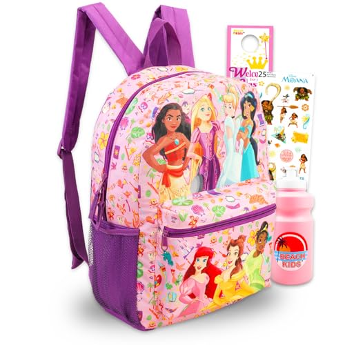 Disney Princess Backpack for Girls - Bundle with 16" School Bag Featuring Ariel, Rapunzel, Cinderella, Moana Plus Water Bottle, Stickers, More | Disney Princess School Bag for Girls