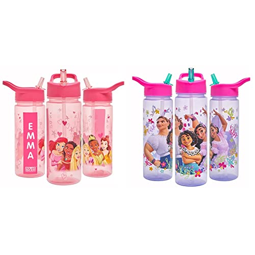 Disney Princess Personalised Sticker Water Bottle with Straw 500ml - Pink & Encanto Water Bottle Flip Up Straw 600ml - Purple & Pink