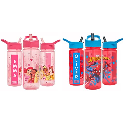 Disney Princess Personalised Sticker Water Bottle with Straw 500ml– Pink & Marvel Spider-Man Personalised Sticker Water Bottle with Straw 500ml, Red & Blue