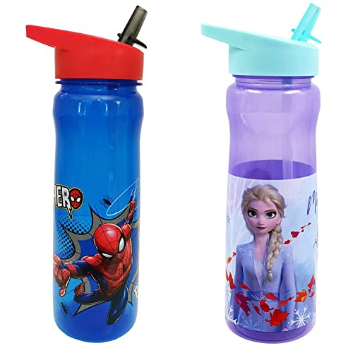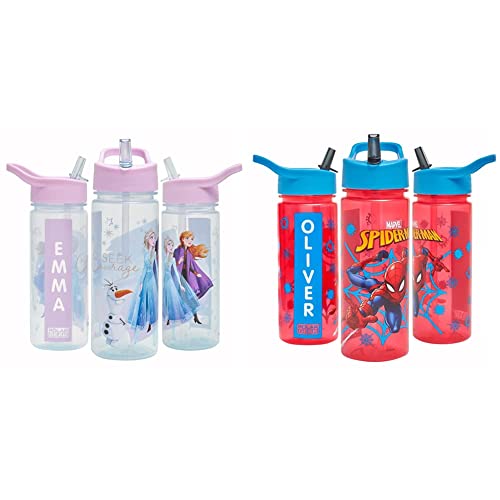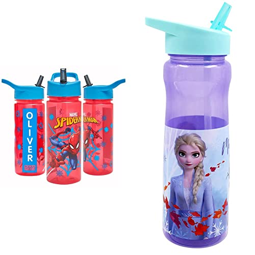 Marvel Spider-Man Personalised Sticker Water Bottle with Straw 500ml, Red & Blue & Disney Frozen Water Bottle with Straw – Kids 600ml PP – in Purple
