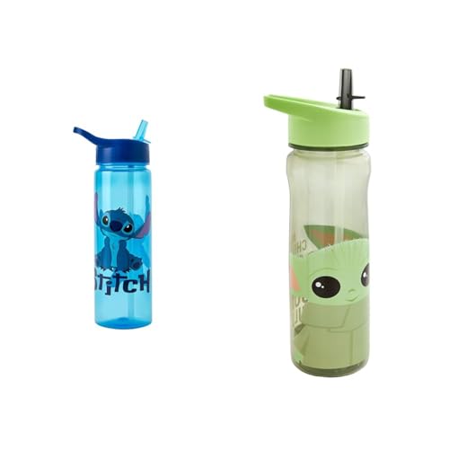Disney Stitch Water Bottle Flip Up Straw 600ml – Official Merchandise by Polar Gear & Mandalorian Water Bottle with Straw – Reusable Kids 600ml PP in Grey & Green – Official Merchandise
