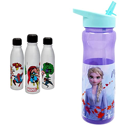Marvel Comics Aluminum Water Bottle 600ml – Official Merchandise by Polar Gear - Multicolour & Disney Frozen Water Bottle with Straw – Reusable Kids 600ml PP, Multi Colour