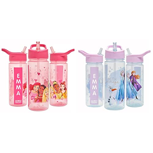 Disney Princess Personalised Sticker Water Bottle with Straw 500ml - Pink & Frozen Magic Personalised Sticker Water Bottle with Straw 500ml - Purple