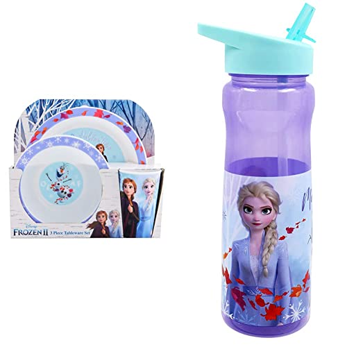 Disney II Frozen Kids Tableware 3 Piece Reusable PP Plate – for 24 Months & Up & Frozen Water Bottle with Straw – Reusable Kids 600ml PP – in Purple, Multi Colour