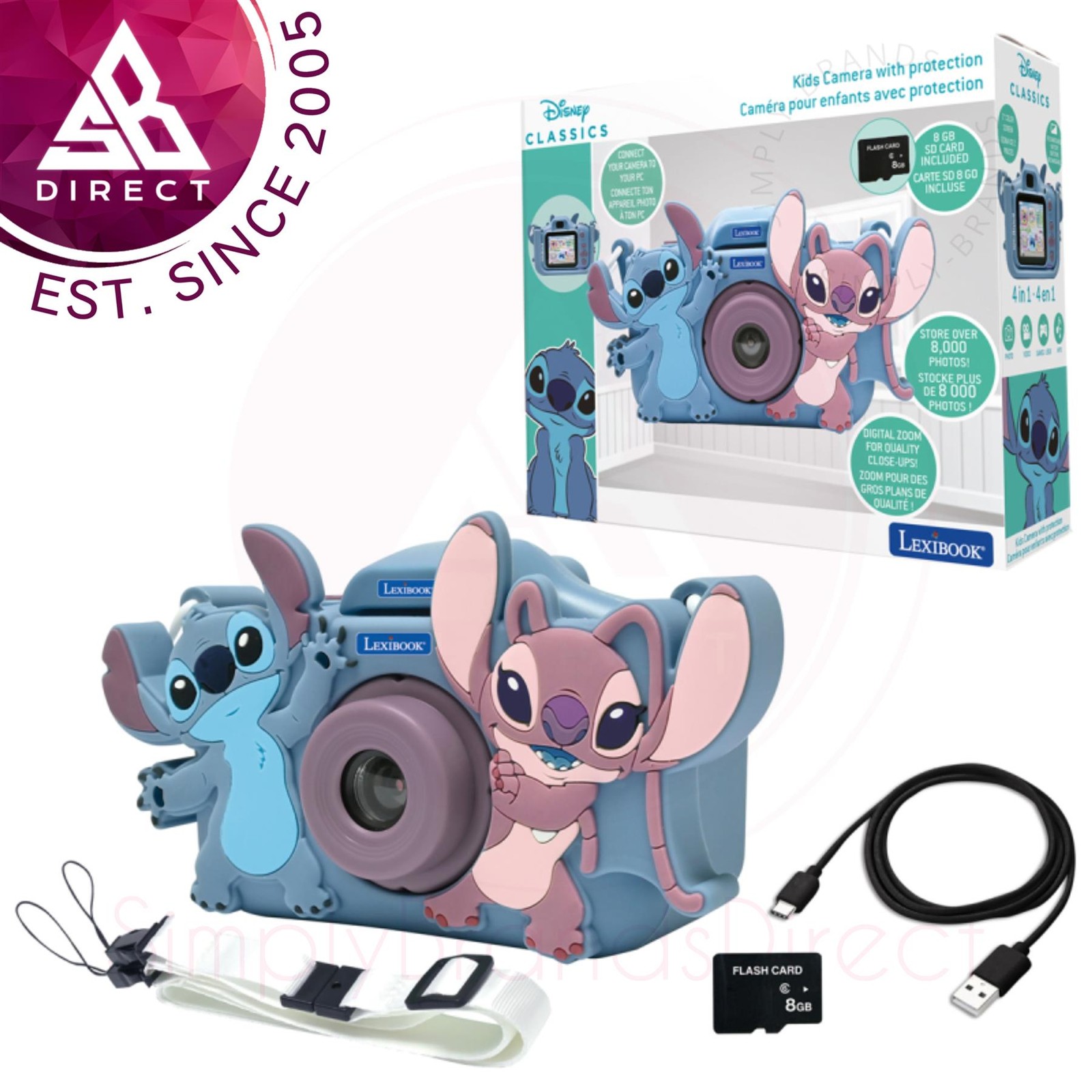 Lexibook DJ078D, Angel, Disney Stitch, 4-in-1 camera for children with protection, video, MP3 and game functions, 15 frames to personalise your photos, 8 GB memory card included