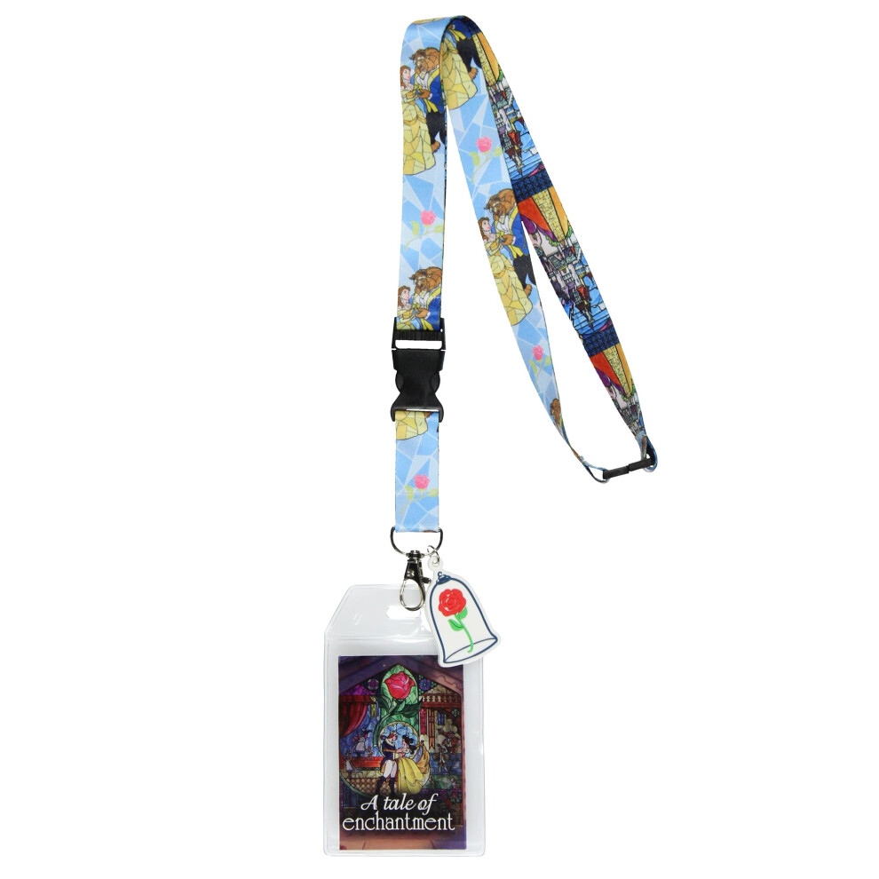 Disney Beauty and The Beast A Tale of Enchantment Lanyard with ID Badge Holder and 2"""" Rose Rubber Charm