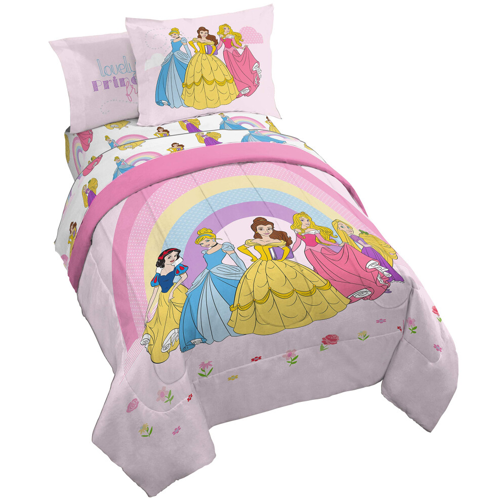 Jay Franco Disney Princess Rainbow 5 Piece Twin Bed Set - Includes Comforter & Sheet Set - Bedding Features Aurora Belle & Cinderella - Super Soft F