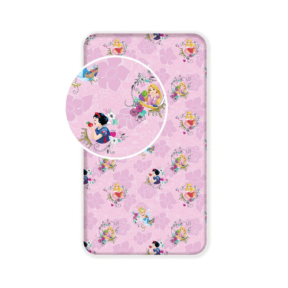 Disney Princess Single Fitted 100% Cotton Bed Sheet - 90x200x25 cm, Pink with Cinderella, Rapunzel, Snow White & Sleeping Beauty