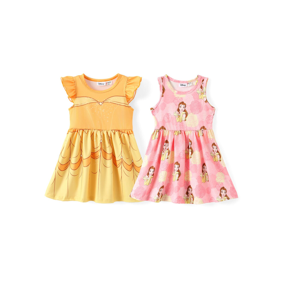 Disney Princess Belle Toddler Girl Dresses 2 Pack Yellow Ruffle Sleeve Costume & Casual Sleeveless Sundress Set Birthday Summer Outfits Clothes 4-5T