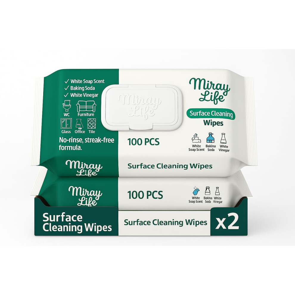 2 x 100 PCS Surface Cleaning Wipes | White Soap Scent, Baking Soda & Vinegar | No-Rinse, Streak-Free Multi-Purpose Wipes for Kitchen, Bathroom, Glass,