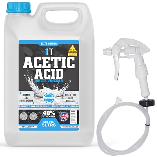 White Vinegar 5L Acetic Acid 40% 8 x Stronger Than Regular Spirit White Vinegar Cleaning for Sanitising & Cleaning - Deodorises & Removes Grime Descaler with Long Hose Trigger Pack of (1, 5 Liter)