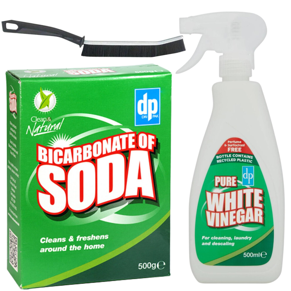 Bicarbonate of Soda for Cleaning 500g (Baking soda for cleaning) with White Vinegar Spray 500 ml and Glameno Crevice Brush