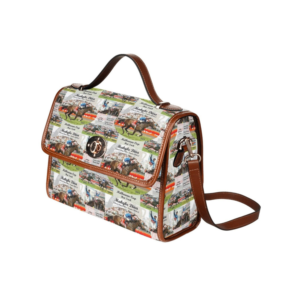 (Makybe Diva Melbourne Cup Hat Trick_7045) Canvas Crossbody Handbag with Lock Top All Over Print Retro Messenger Bag for Women, Girl Brown Trim & Adju