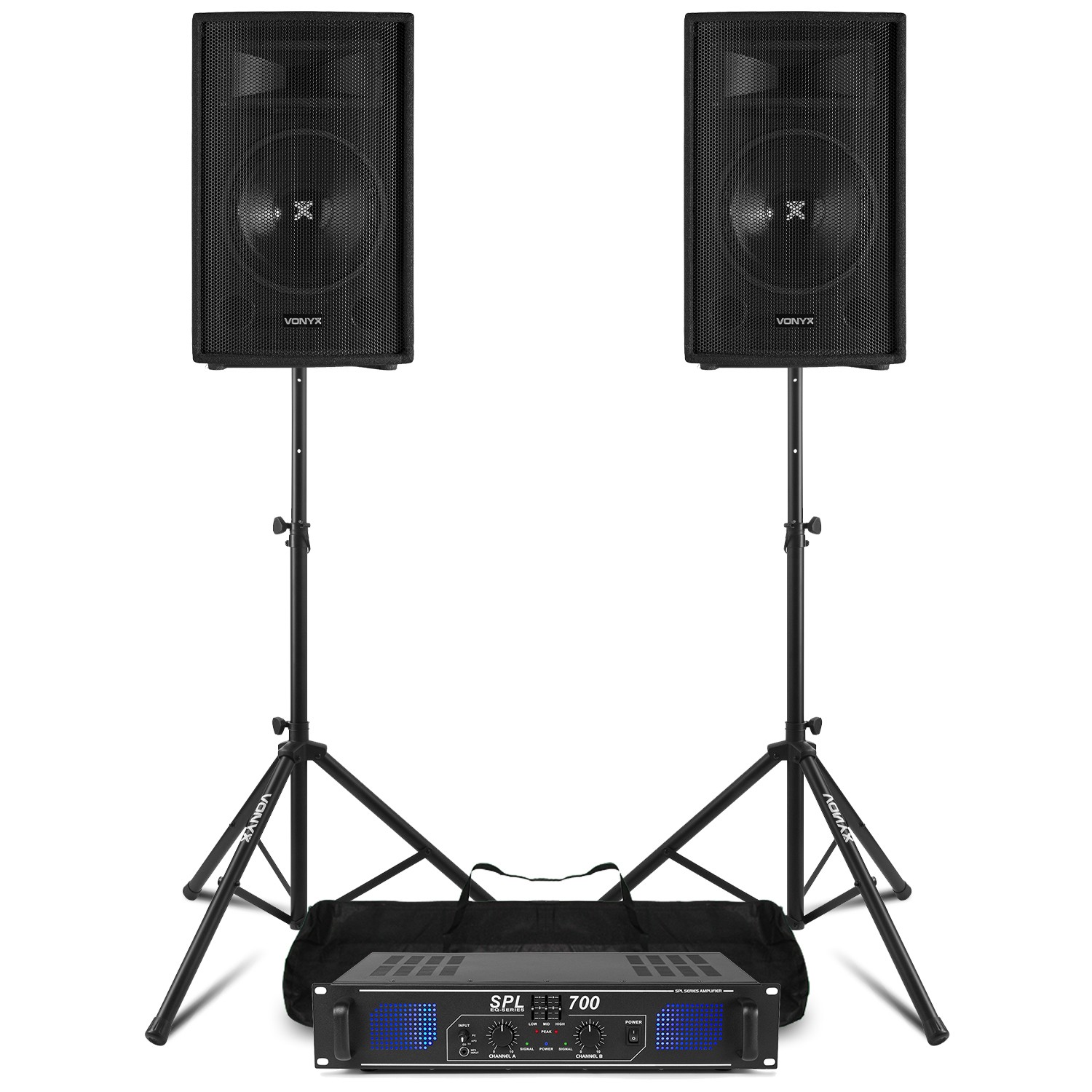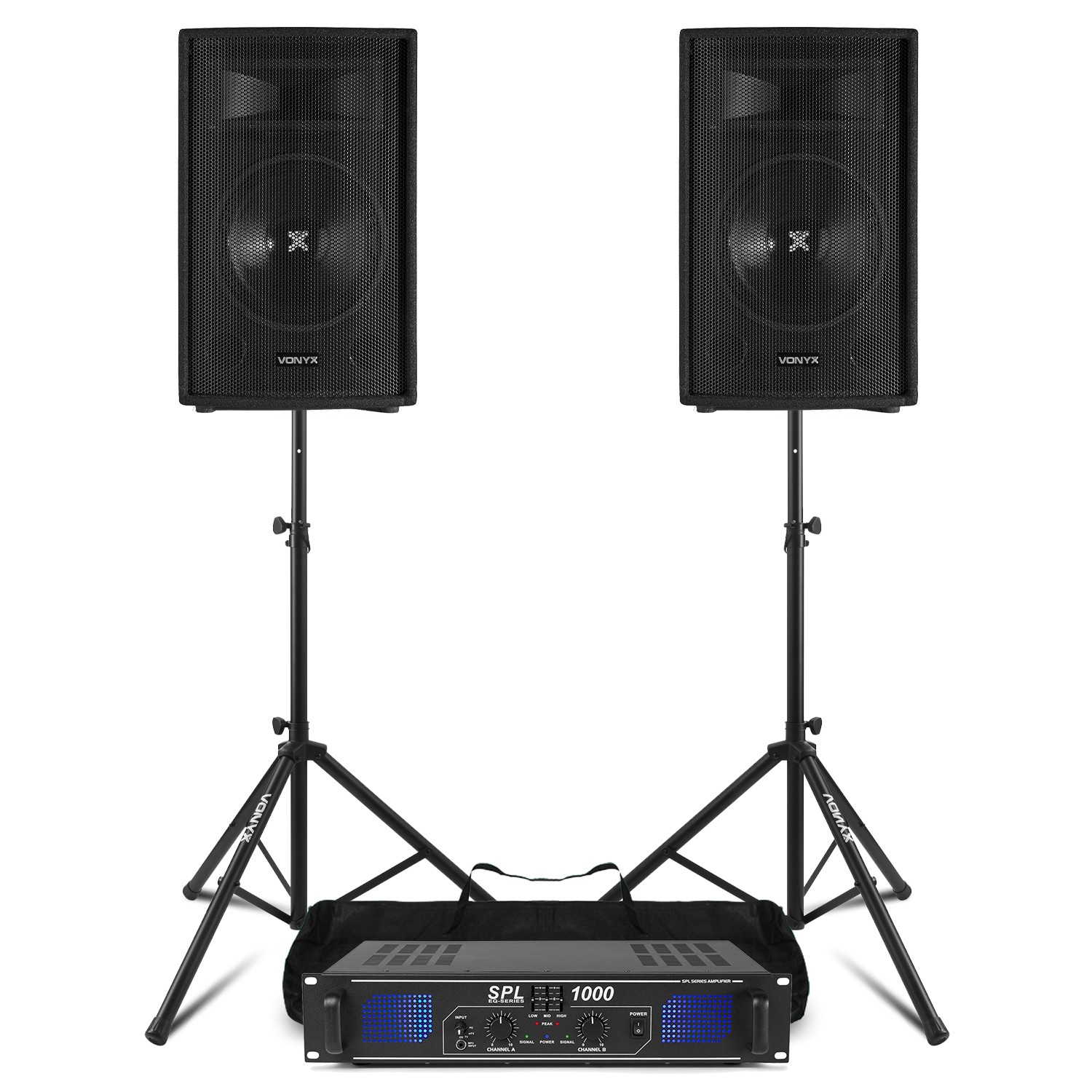 Vonyx VSA150S 15" Active PA DJ Speaker Package with Stands and Cases