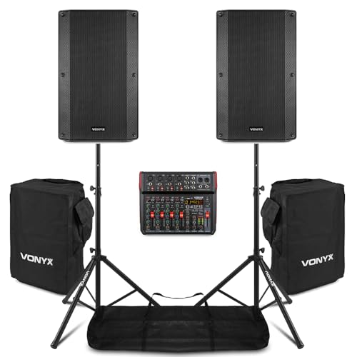 VONYX VSA120S 12-Inch Active PA System with 8-Channel PA Mixer, Bluetooth, DSP Effects, Speaker Stands, Protective Carry Bags and XLR Cables - 800W Professional DJ Speaker Kit