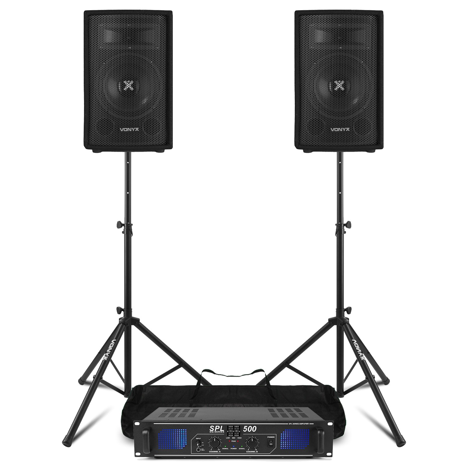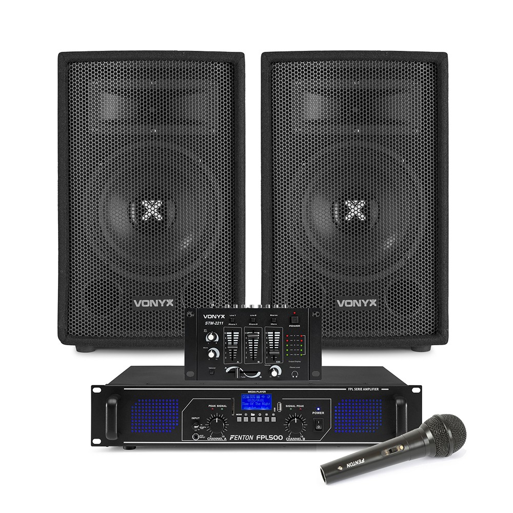 Vonyx SL10 10” Passive DJ PA Speaker Kit with Stands and Amplifier - 500W