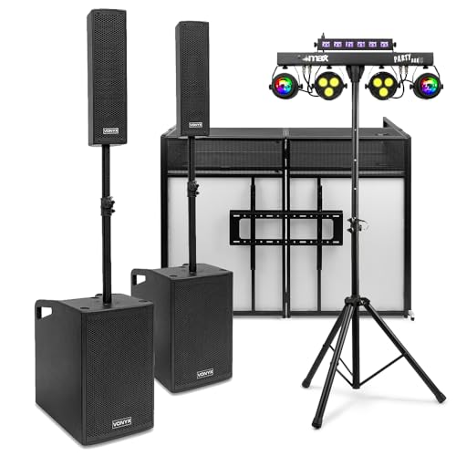 Vonyx VX1050BT Mobile DJ Setup, Column Array Speaker, DJ Booth with TV Mount, LED Lighting System & Soft Cases, Complete PA System Package for Weddings, Parties & Events