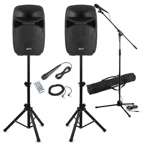 VONYX VSA120S 12" Active DJ Speaker System 800W with Speaker Stands, Bluetooth Streaming, MP3 USB Playback & AUX Cable - Live PA Sound Solution