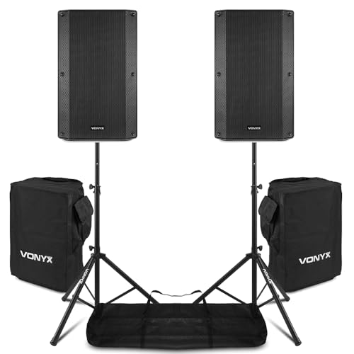 Vonyx VSA15BT Active DJ Speaker Pair - 15 Inch Bi-Amplified with Stands & Bags