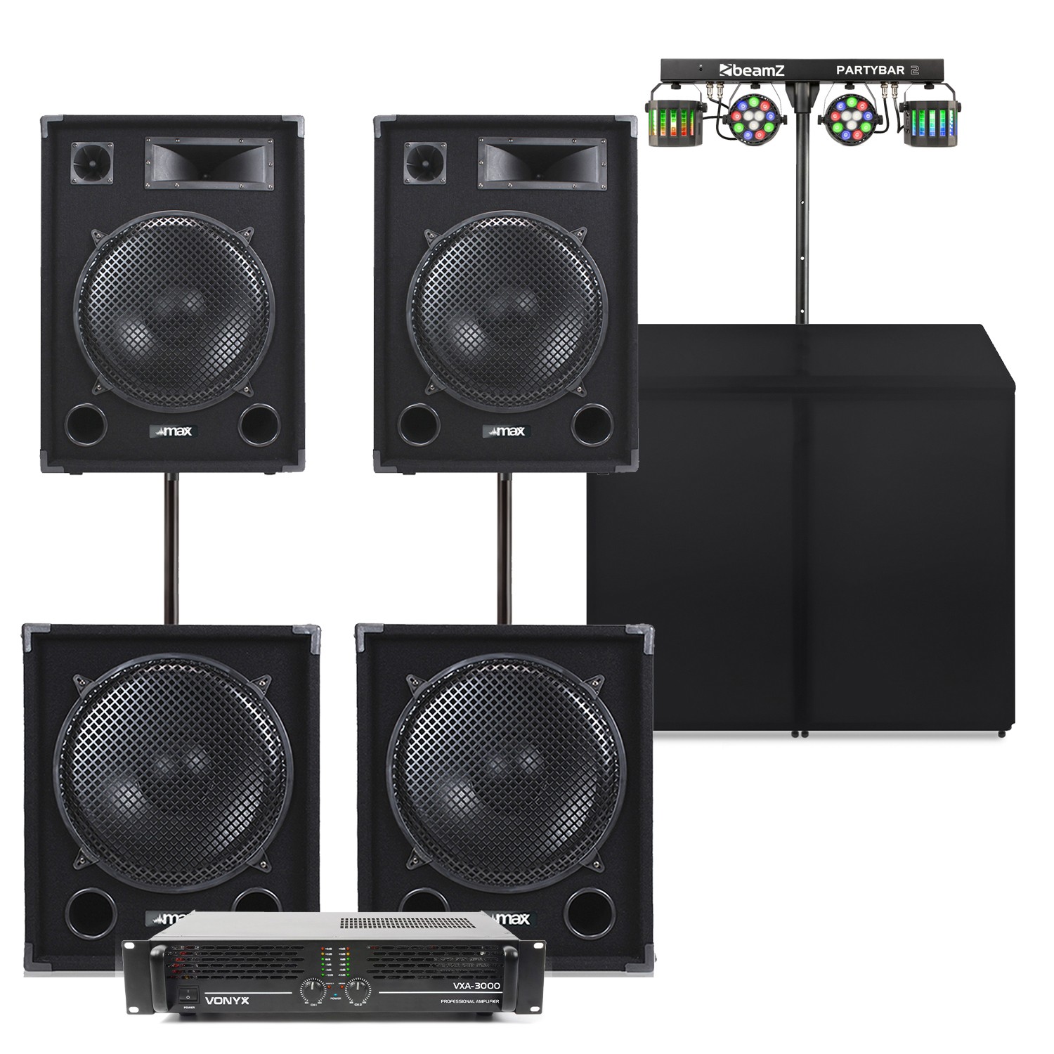 MAX 15" Passive DJ Speaker Setup with Subwoofers, DJ Booth, Stands & LED Lights