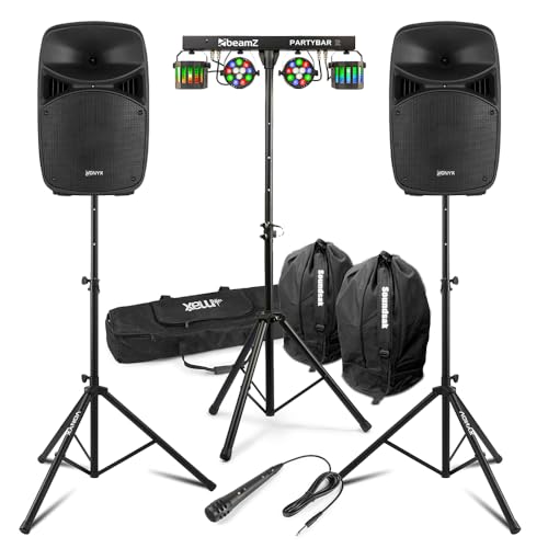 Vonyx VPS102A 10" Active DJ Speaker System Set with BeamZ PartyBar2 Lighting, Speaker Stands, Microphone & Carry Bags - Complete Home DJ Setup Kit
