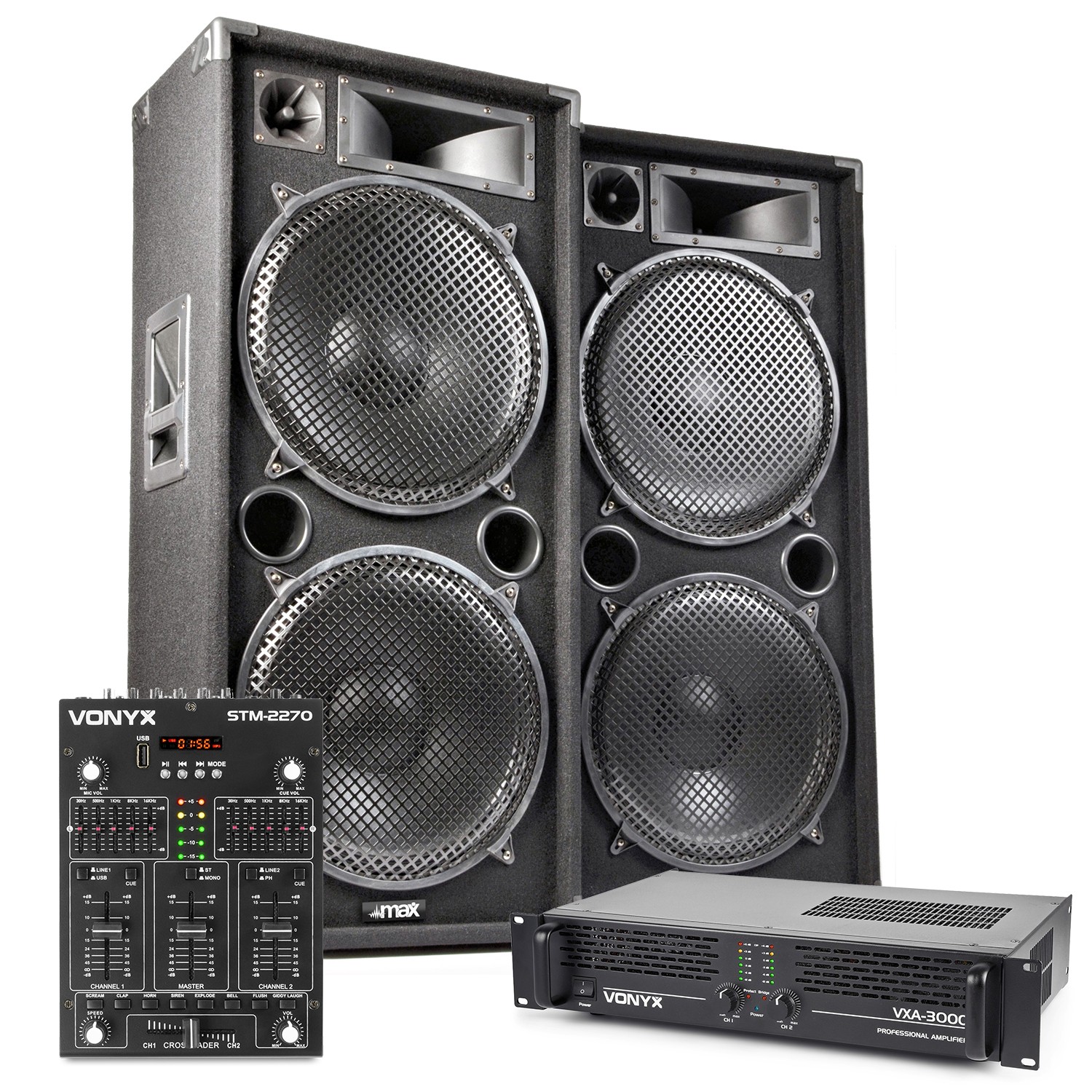 MAX215 Dual 15" Passive DJ PA Speaker Kit with Amplifier and DJ Mixer - 3000W