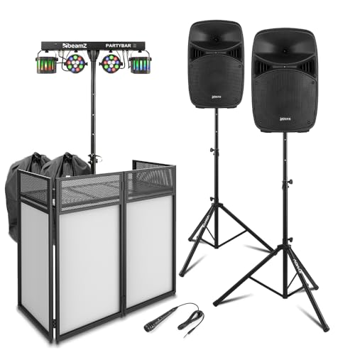 Vonyx VPS102A 10" Active DJ Speaker Package with DJ Booth, BeamZ PartyBar2 Disco Lighting System, Speaker Bags & Stands - Complete Home DJ Setup for Small Gigs