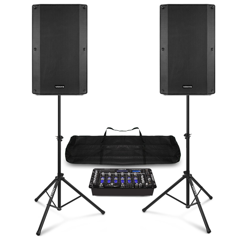 15" Active DJ Speaker Package with STM-3007 DJ Mixer and Stands - Vonyx VSA150S