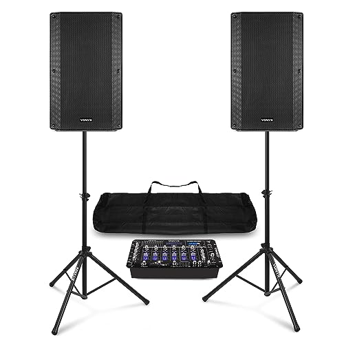 VONYX Active DJ Speaker Package, 2x VSA15 Powered Speakers, 1000W Bi-Amplified 2-Way Crossover, DJ Plinth Stands with Lycra Scrims, 3 Inputs for Guitar, Line or Mic, DJ Speaker Kit