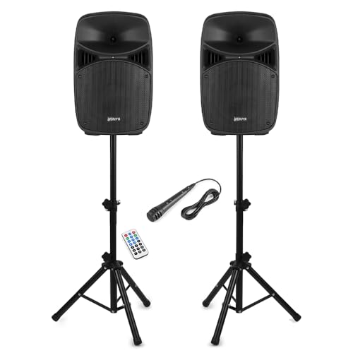 Vonyx VPS102A 10" Active DJ PA Speaker System with Bluetooth, USB/SD MP3 Playback, Adjustable Sound Control, Active/Passive Pair with Microphone & Speaker Stands Included