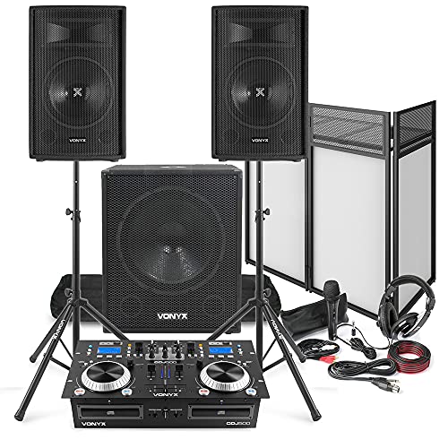Full DJ Setup PA System with 2x 12" Passive Speakers, 18" Active Subwoofer, Dual CD DJ Mixer Amplifier, DJ Booth, Speaker Stands, Mic, Headphones & Cables for Mobile DJ Events Parties Weddings Gigs