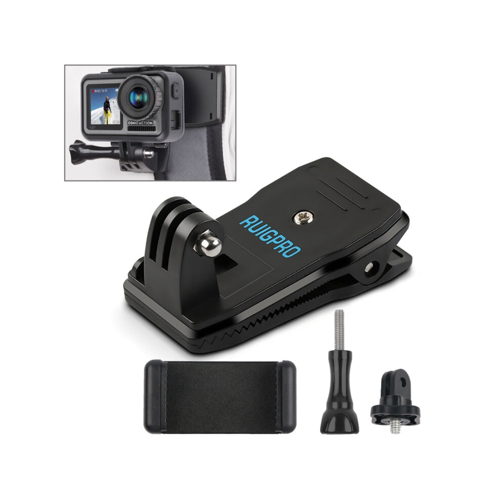 RUIGPRO 360 Rotation Backpack Mount + Phone Clamp for GoPro, DJI Osmo, Xiaoyi Cameras (Black)