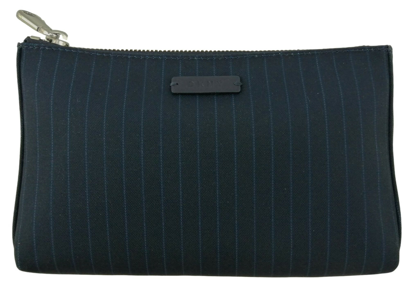 DKNY Make Up Bag Travel Case Cosmetic Pouch Canvas Navy Pin Stripe Dark Blue