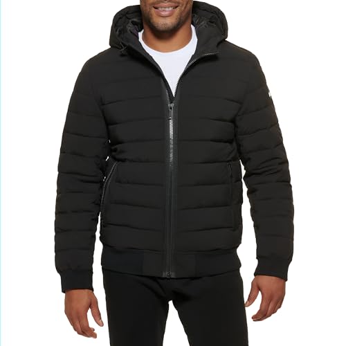DKNY Men's Quilted Performance Hooded Bomber Jacket Down Alternative Coat, Black Matte Stretch, Small