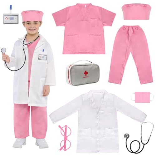 Amtum Kids Doctors Outfit Doctor Costume Kids with Lab Coat,Stethoscope,Scrubs Costume, Mask Doctor Nurse Dress Up Child Role Play Costumes for Girls 7-8 Years Pink/130