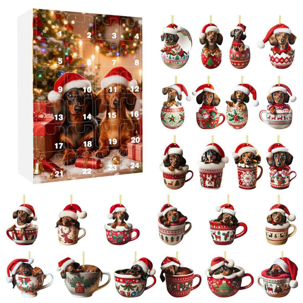 (Set; 24 Pieces) Dachshund Dog Advent Calendar - Acrylic Christmas Countdown with 24 Assorted Ornaments