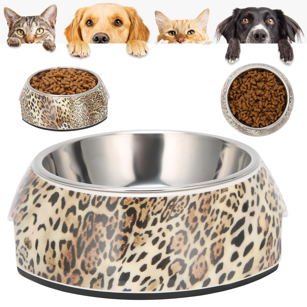 2 in 1 Dog Food and Water Bowl AntiSlip Base Stainless Steel Pet Bowl Feeder Dish(L for Leopard Pattern)