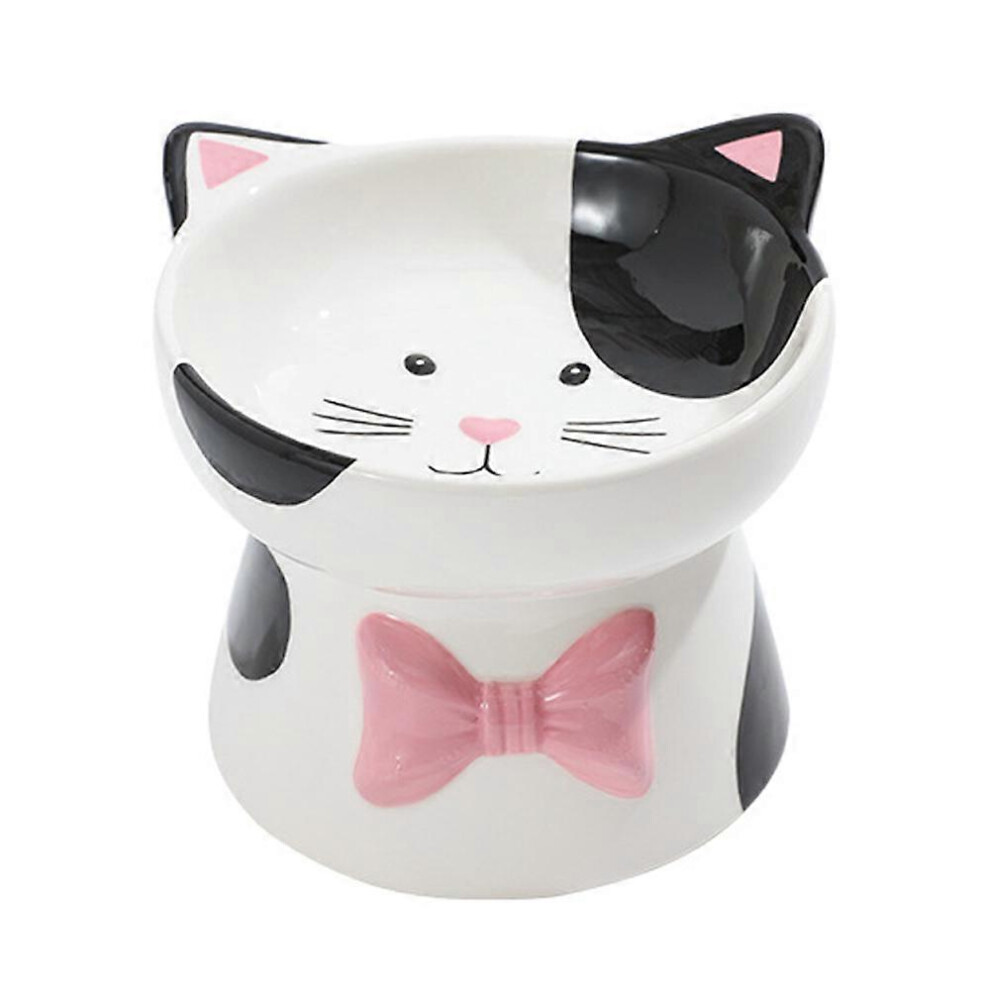 (As show, Flat Bowl) Ceramic high-footed cat bowl with contrasting color cat head and dog food bowl