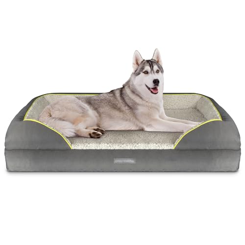 Dreamcatcher Extra Large Dog Bed Plus 122x89x20cm, Orthopaedic Memory Foam Bolster and Non Slip Base with Sherpa Fleece Top. Grey Waterproof Oxford Fabric Sides and Removable Washable Cover